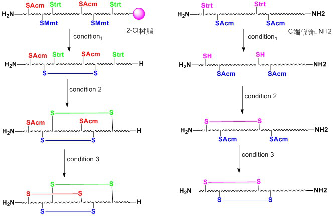 When it is necessary to form two or more pairs of disulfide bonds, the synthesis process is relatively complex. Although the formation of disulfide bonds is usually completed in the final stages of the synthesis protocol, sometimes the introduction of preformed disulfides is advantageous for joining or lengthening the peptide chain. Sulfhydryl groups are usually used as protective groups such as trt, Acm, Mmt, tBu, Bzl, Mob, Tmob and so on. We have listed two routes for the formation of polydisulfide bonds on peptides synthesized with 2-Cl resin and Rink resin as carriers respectively: